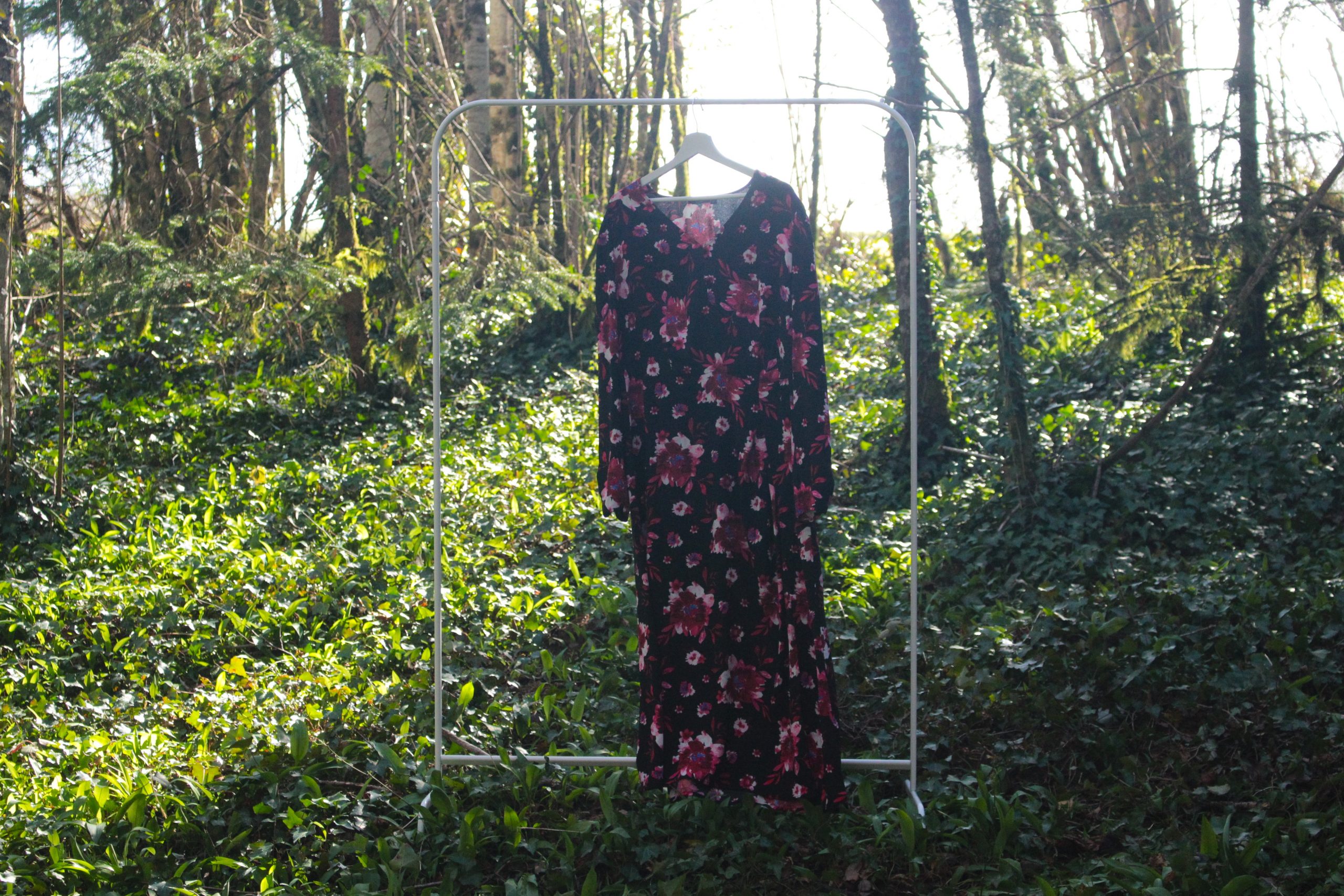 Cette robe Kiabi séduit par son fond noir intemporel rehaussé d’un imprimé floral multicolore lumineux et féminin.