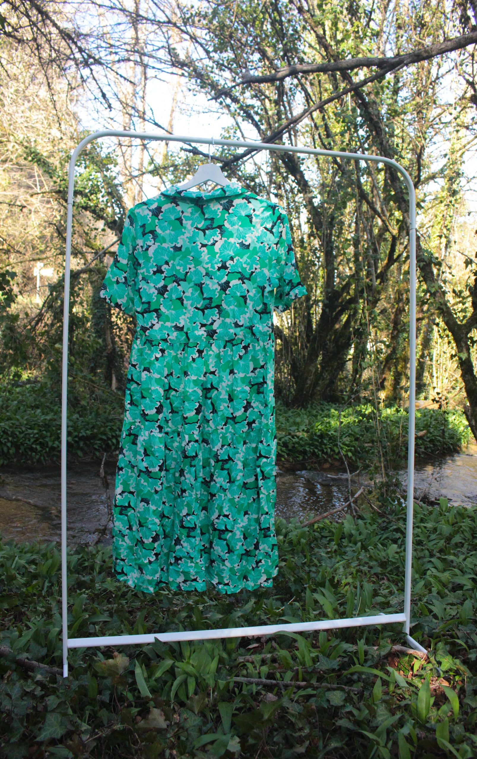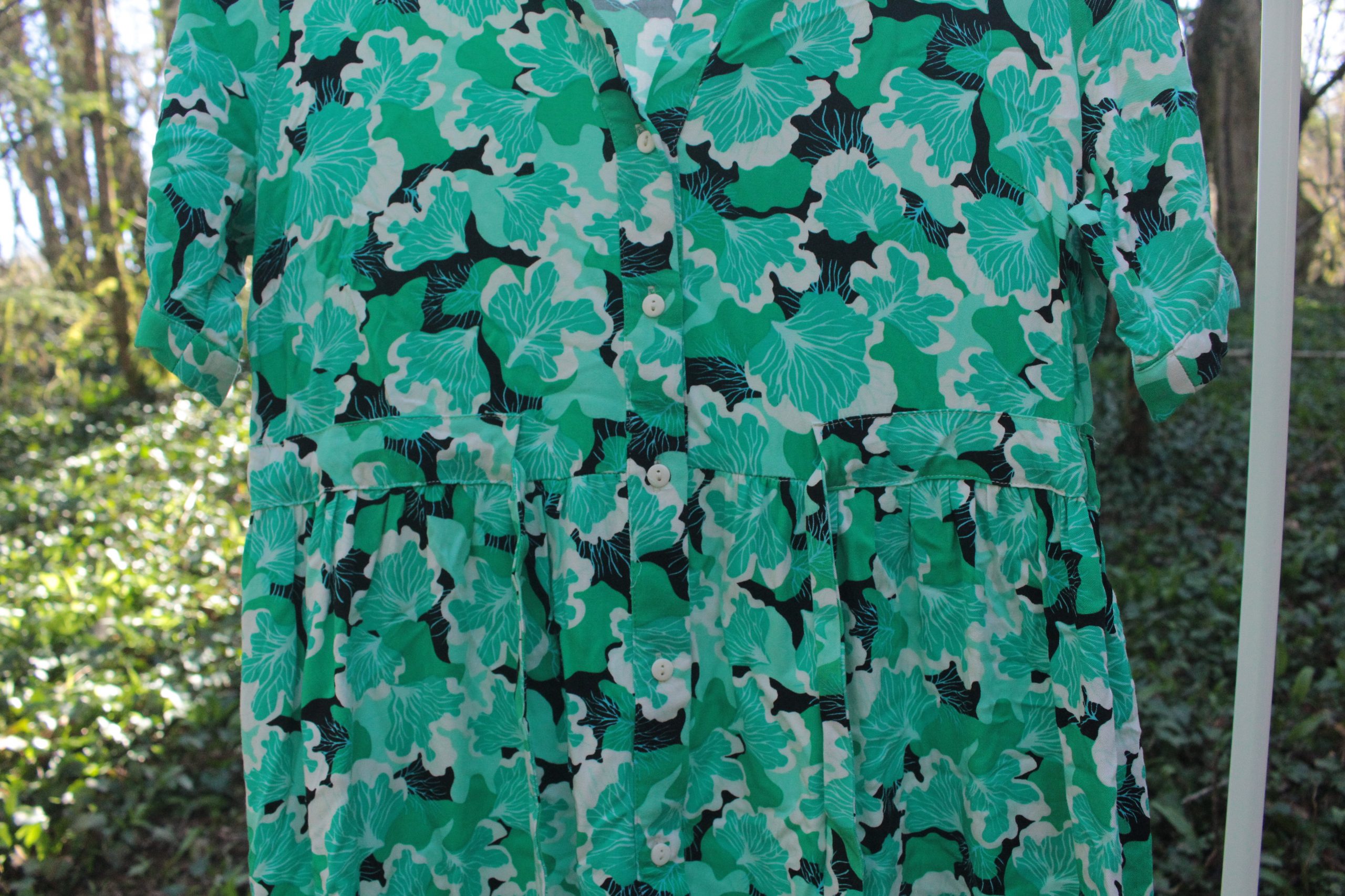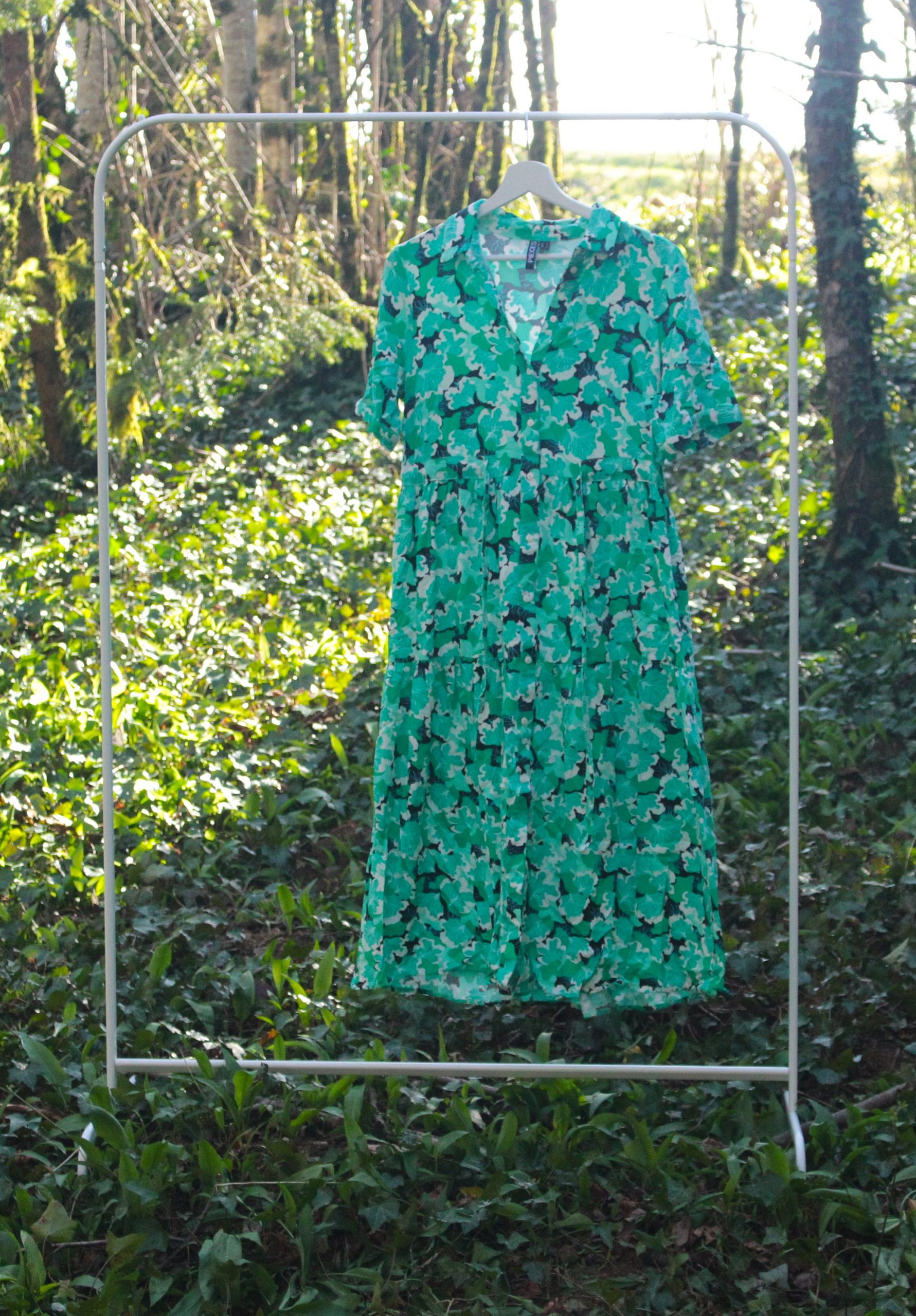 Cette robe chemise coupe midi Etam se distingue par son imprimé végétal composé de différentes nuances de vert, apportant fraîcheur et modernité.