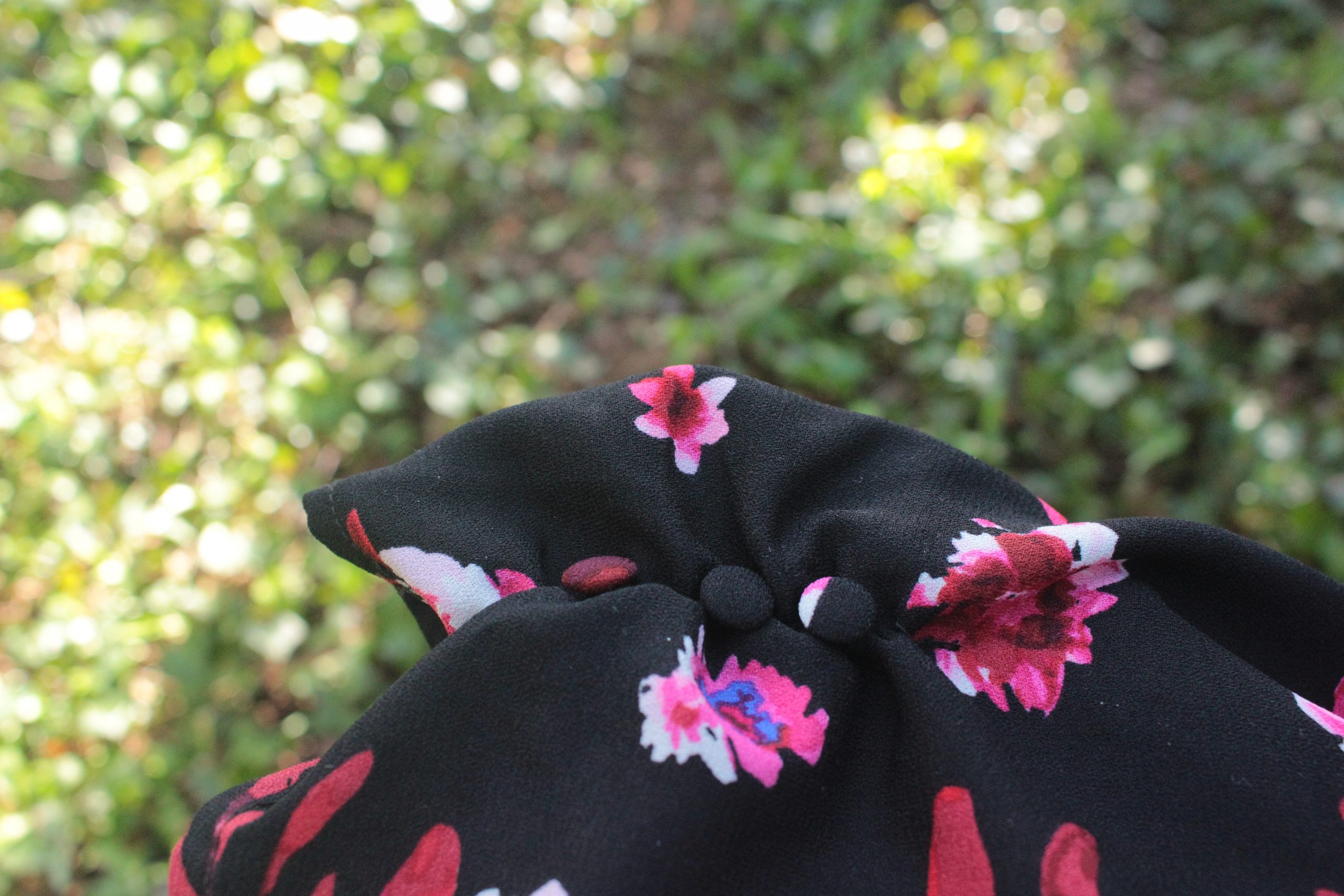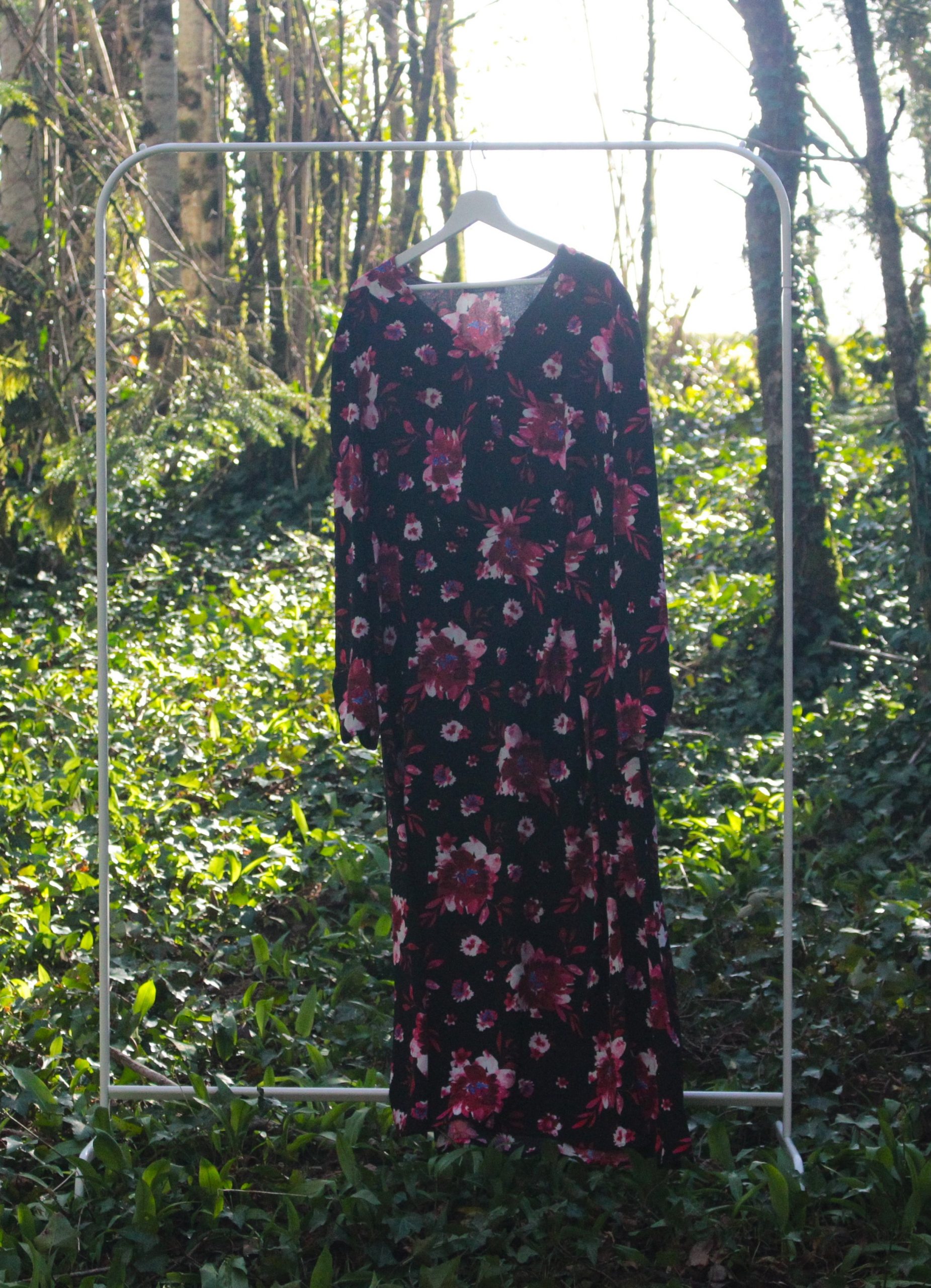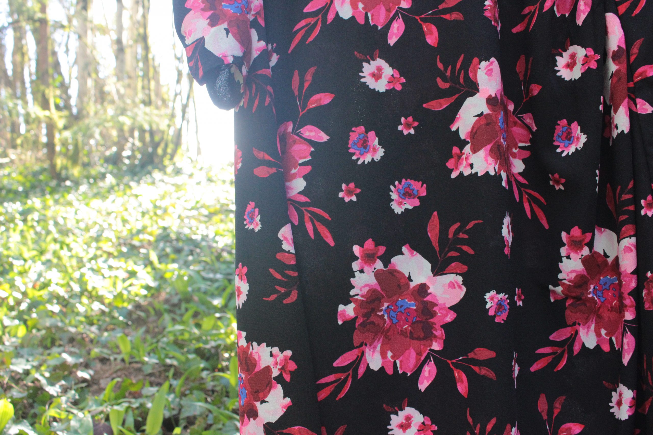 Cette robe Kiabi séduit par son fond noir intemporel rehaussé d’un imprimé floral multicolore lumineux et féminin.