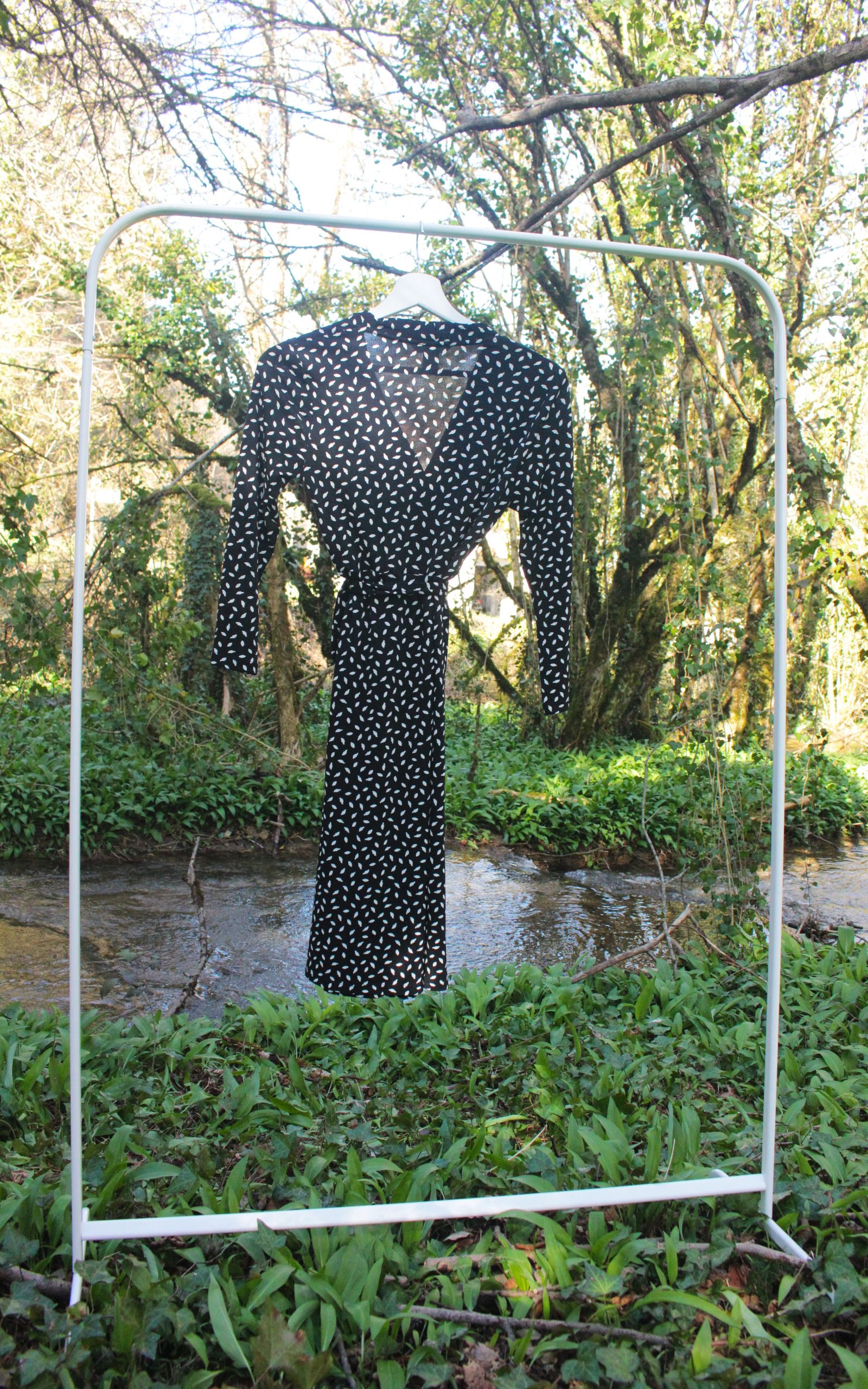 Le décolleté apporte une touche féminine, tandis que la ceinture permet d’ajuster la silhouette selon l’évolution du corps.