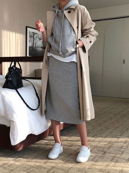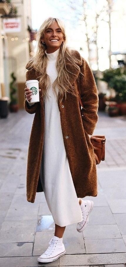 Pour les audacieuses : Une Robe over size ceinturée, un manteau long fluide, et une paire de sneakers pour casser les codes.